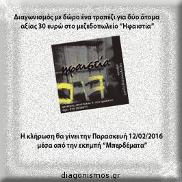 Τα δώρα του διαγωνισμού είναι ένα τραπέζι για δύο άτομα αξίας 30 ευρώ στο μεζεδοπωλείο “Ηφαιστία»