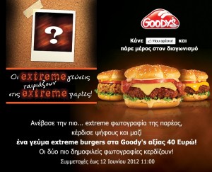 Ο διαγωνισμος χαριζει 2 γεύματα Extreme Burgers στα Goody's για 2 παρεες αξίας 40€Για να λαβετε μερος στην κληρωση επισκεφθειτε αυτη τη σελιδα